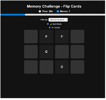 Memory Flip Challenge is a relaxing yet mentally stimulating card-matching game. Flip two cards at a time and try to match all the pairs with the fewest moves and in the shortest time possible.